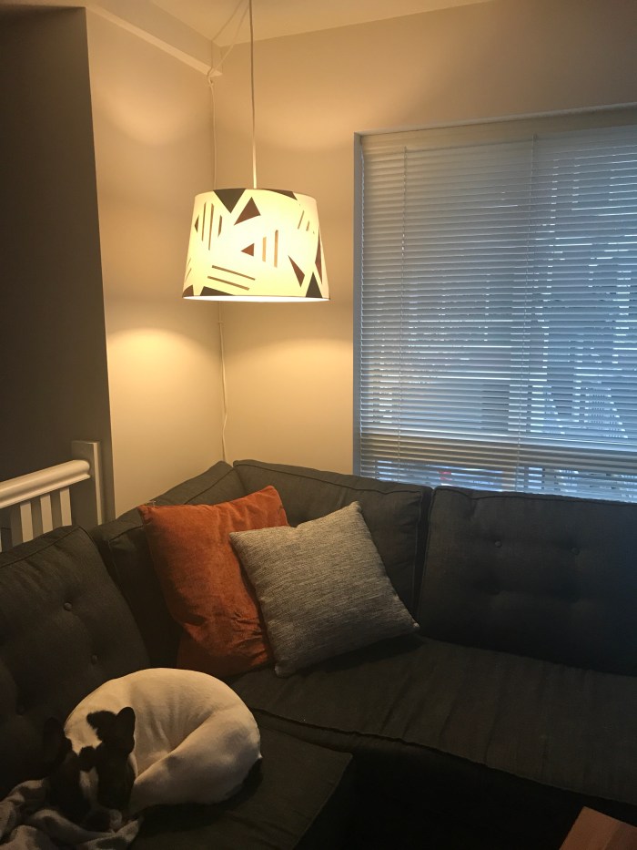 A boring white lamp shade is just a boring white lamp shade. That is until… a few randomly placed strips of masking tape, bronze and silver metallic acrylic paint and a rainy afternoon transforms it into something new.