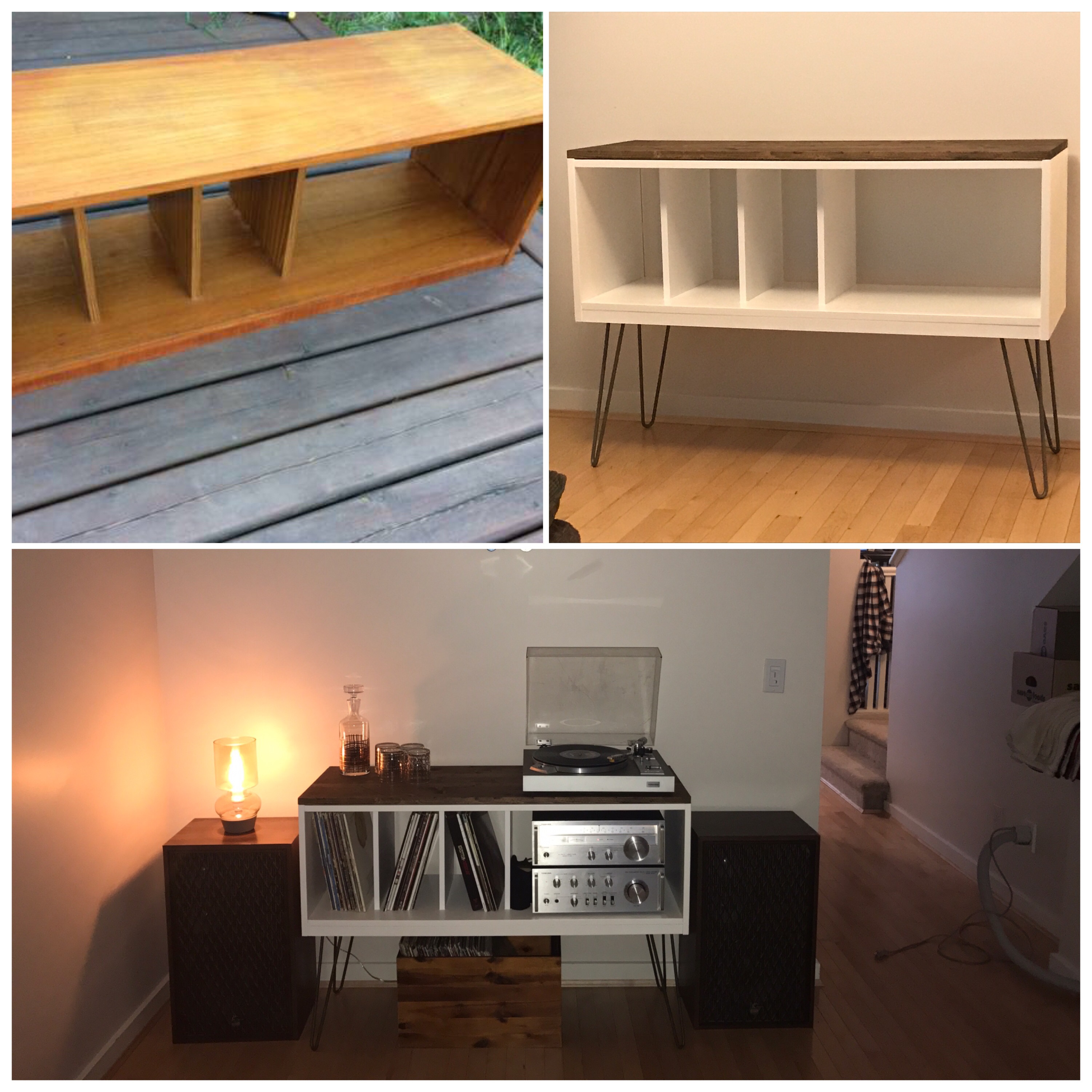 You can buy it, or you can up-cycle it. Picked up the original faux teak stand on the cheap via Craigslist, primed and painted it white, then added a stained (Early American) pine top and hairpin legs.